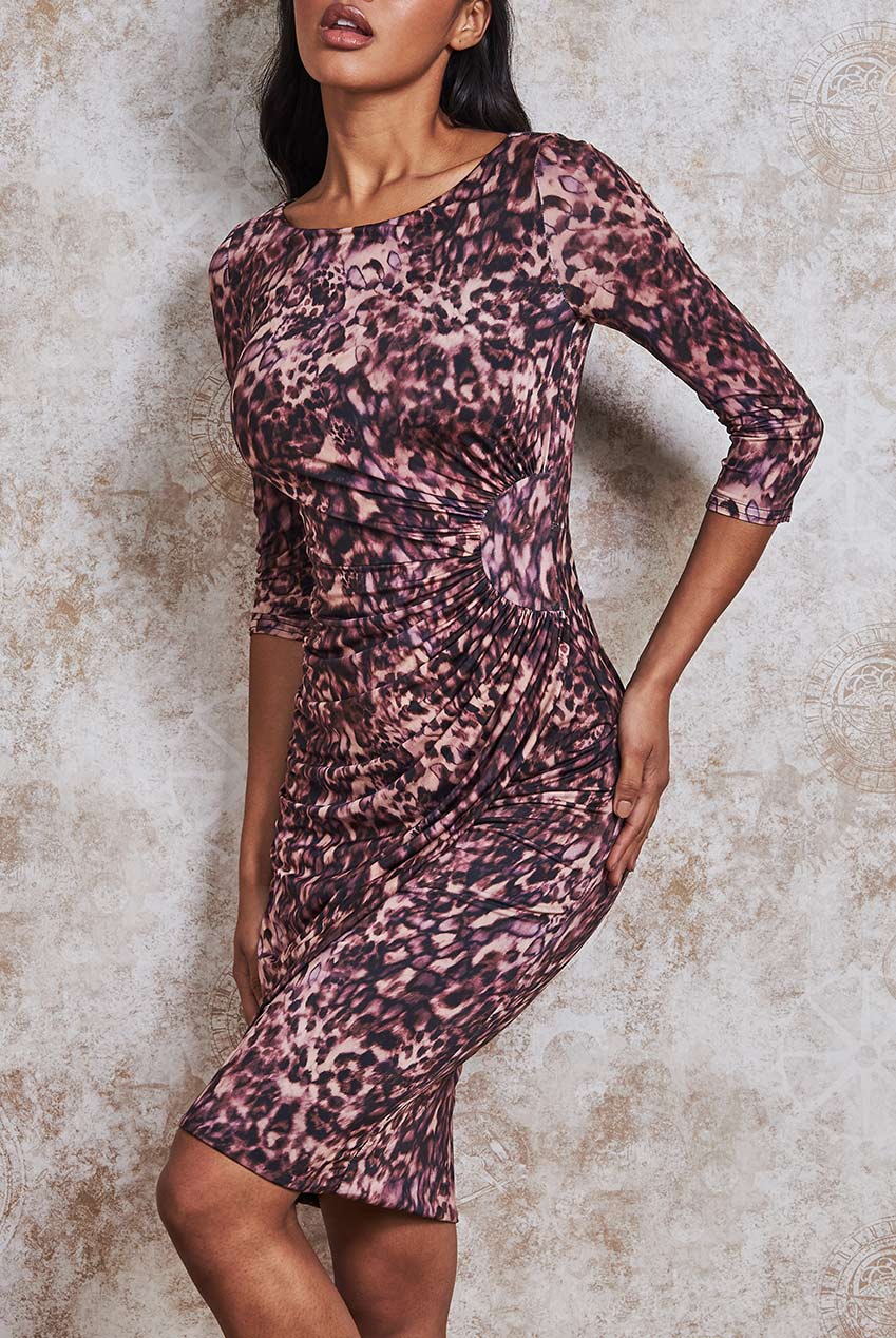Robe portefeuille mi-longue à col rond et imprimée animalier