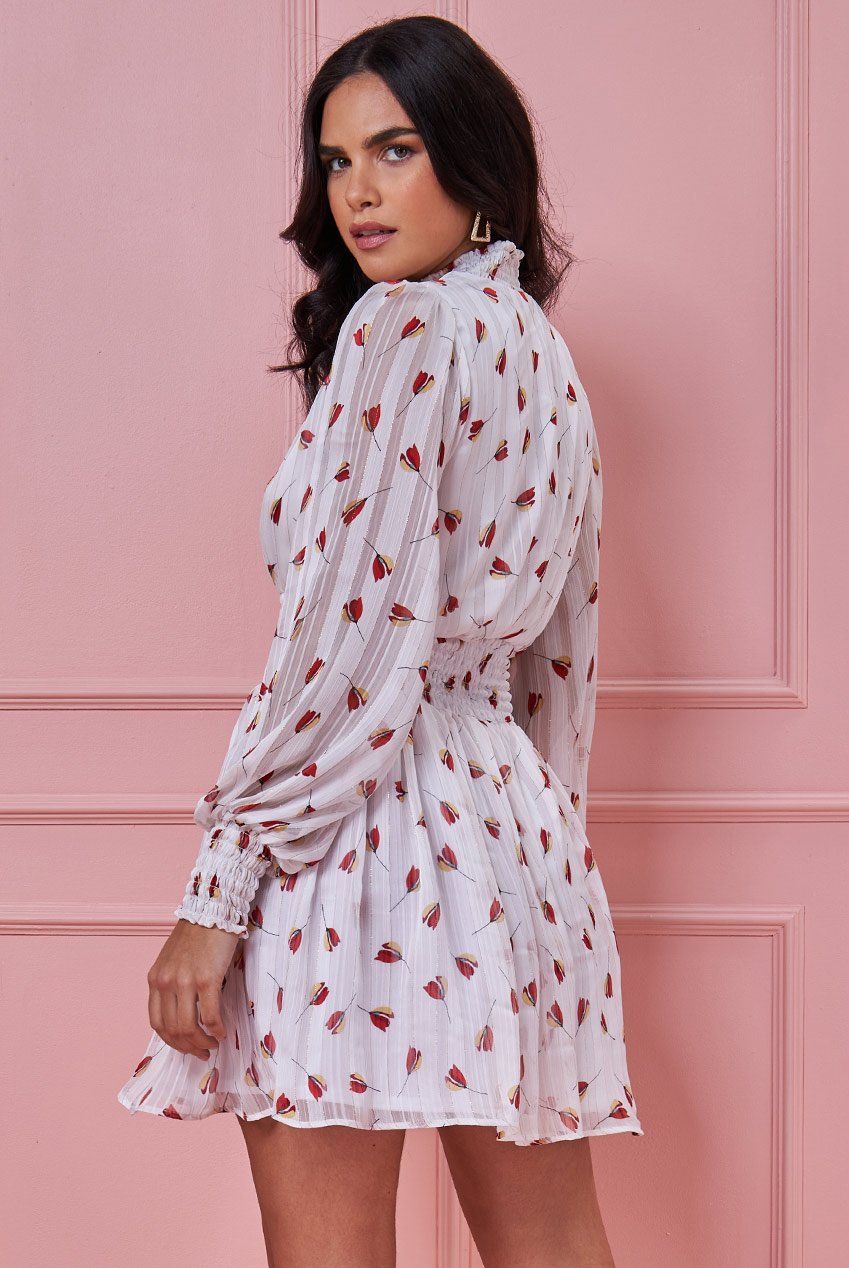 La robe sirène mi- longue en fibre synthétique recyclé présente des imprimés fleuris rouge et blanc. Sa coupe à ourlet en queue de poisson évasée est sublimée par une ceinture en velours soulignant la taille et les poignets de ses manches. Elle pourrait être associée à des bottines et un manteau pour total look chic et glamour